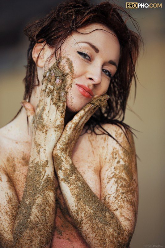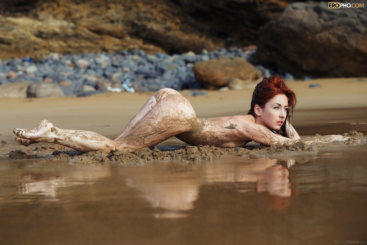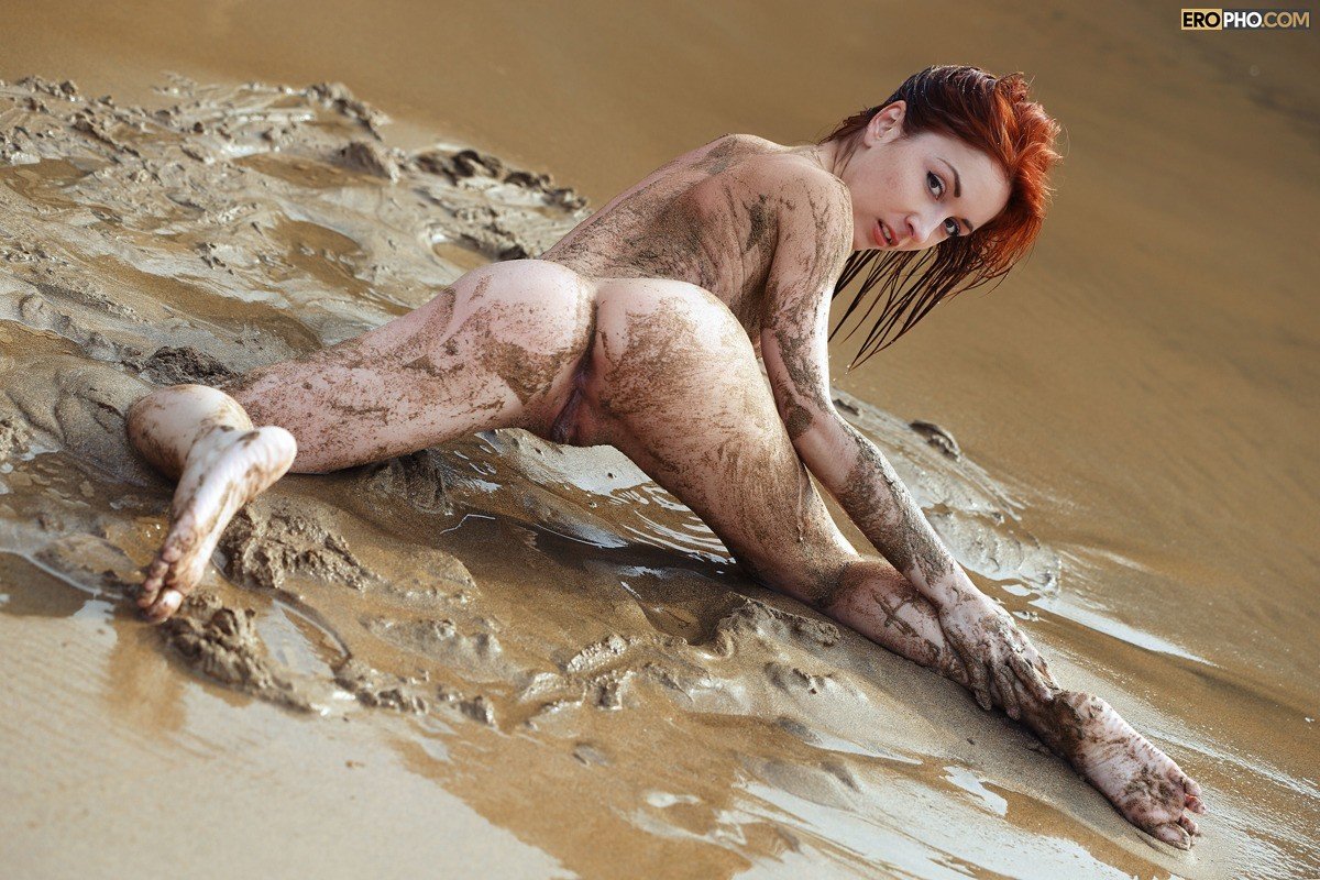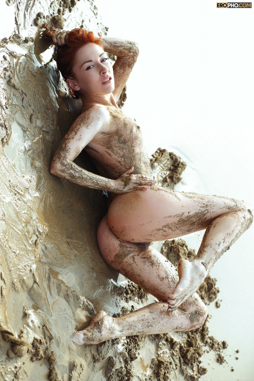 Веселая рыжеволосая проказница выехала с другом за город и принялась принимать грязевые ванны. Красивая барышня с прикольной стрижкой на лобке пару минут двигала булками перед самцом, а затем начала почесывать половые губки. Вскоре голая шалунишка улеглась в лужу и стала в ней купаться. Как не странно, но от всего этого тян возбудилась, а также очень сильно завела партнера с фотокамерой. Дамочка купалась в грязи и при этом весьма активно натиралась пальцами соски. Перепачкавшись с головы до ног, порочная стерва наклонилась и приступила теребить сильно напряженный розовый клиторок.